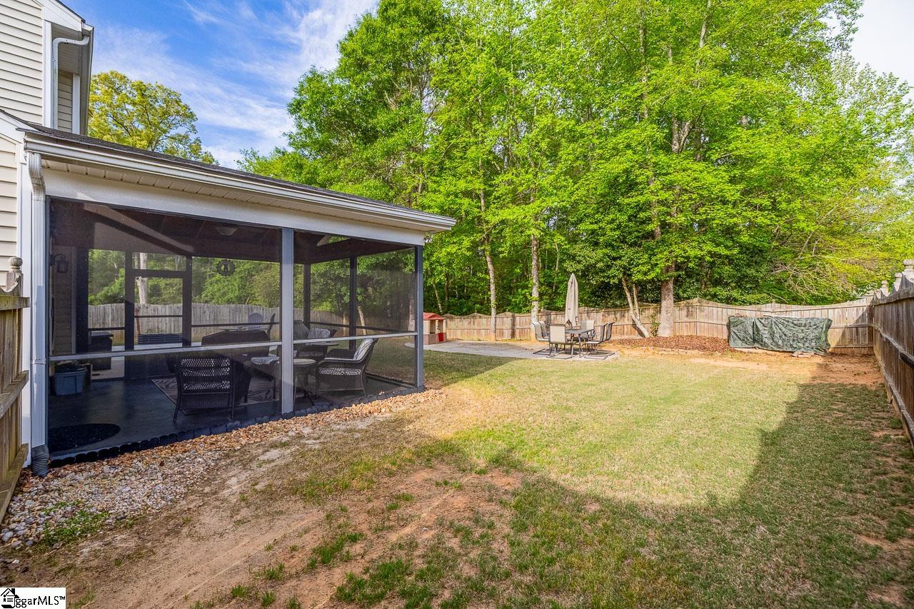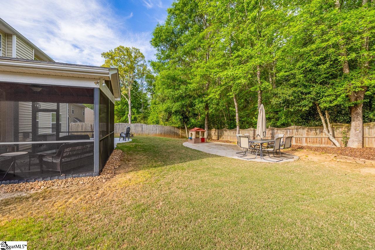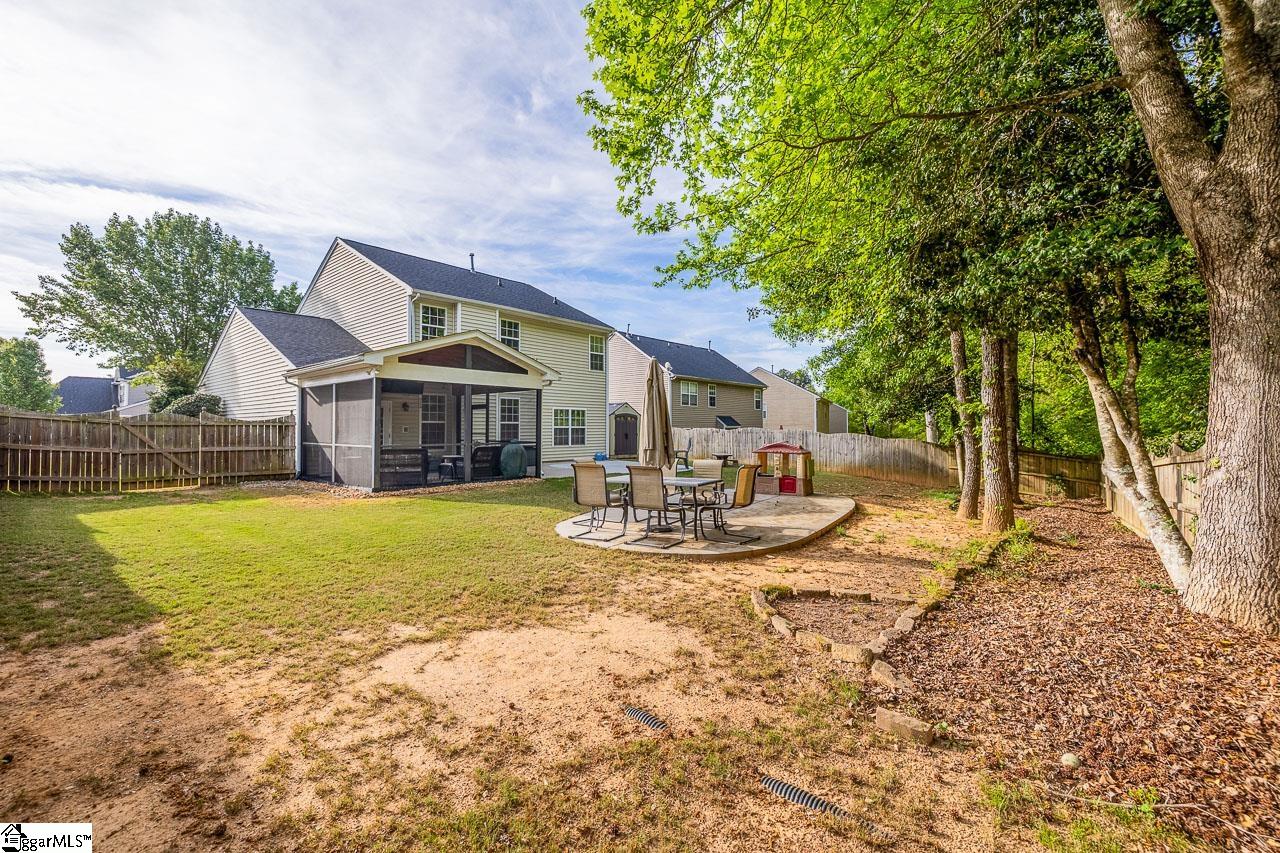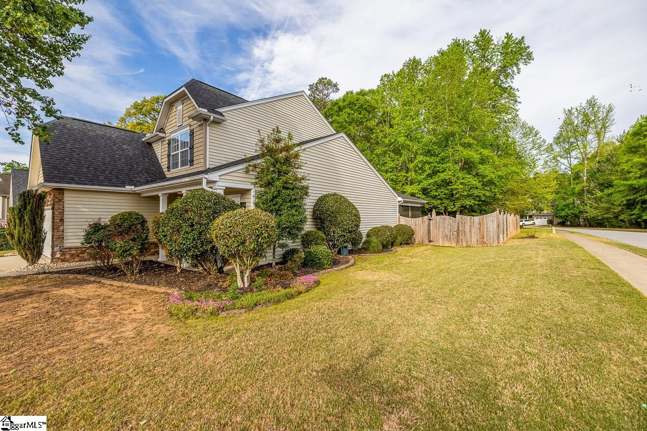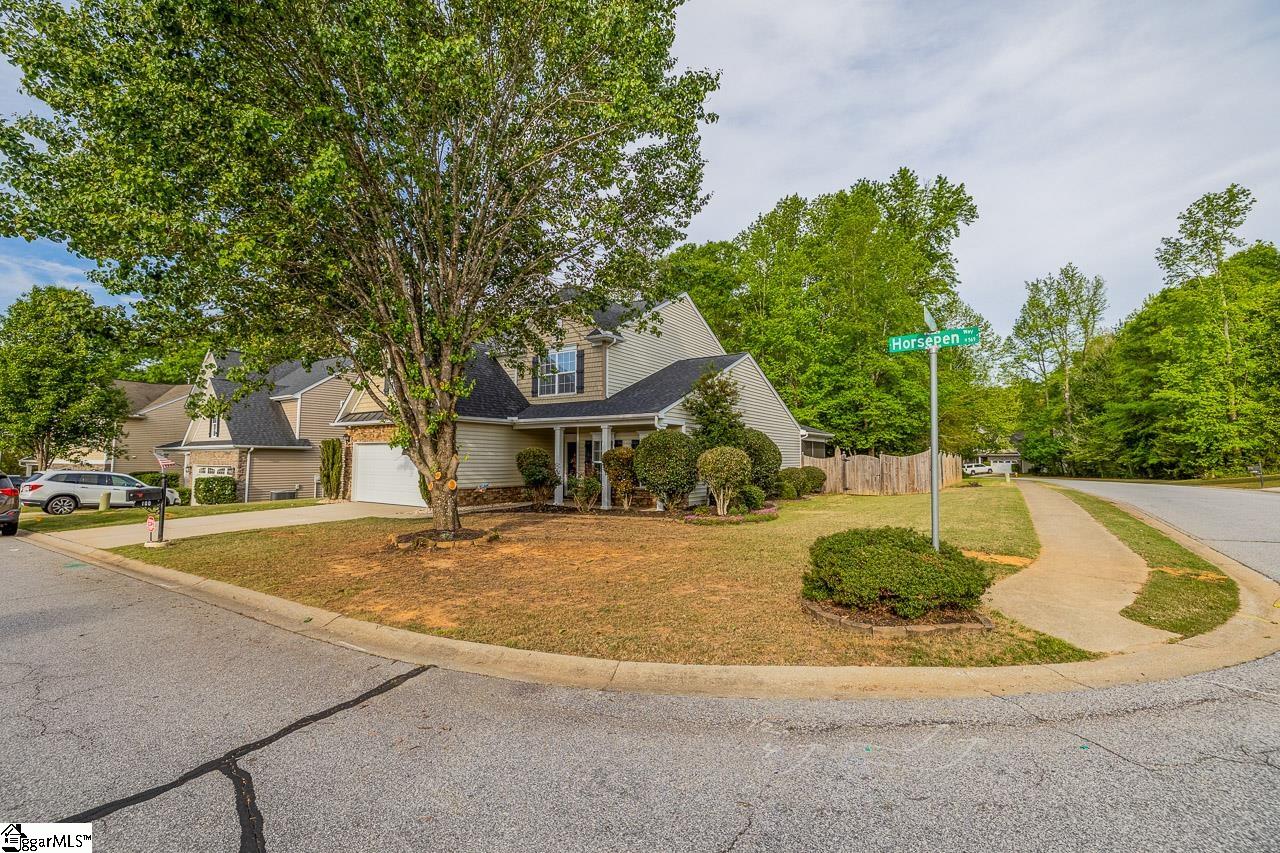 Welcome to this charming 4-bedroom, 2.5-bath traditional home nestled on a wooded corner lot in the sought-after Bells Creek community of Simpsonville. With approximately 2,218 square feet of thoughtfully designed living space, this home offers an open floor plan with soaring 9ft+ ceilings, hardwood floors, and a cozy gas fireplace. The main level features a spacious kitchen with solid surface countertops, a primary suite with a garden tub, separate shower, double sinks, and a walk-in closet. Upstairs you’ll find three additional generously sized bedrooms, perfect for family or guests. Enjoy relaxing on the screened porch overlooking the level, tree-lined backyard. The attached 2-car garage, paved driveway, and community amenities including a pool, common areas, and sidewalks round out everything this home has to offer.