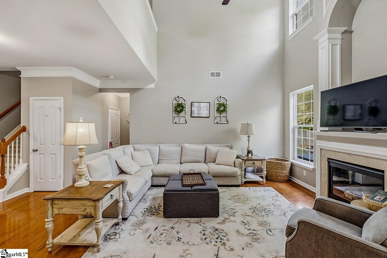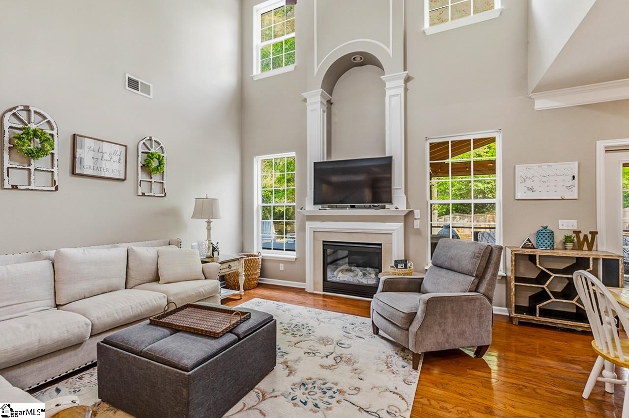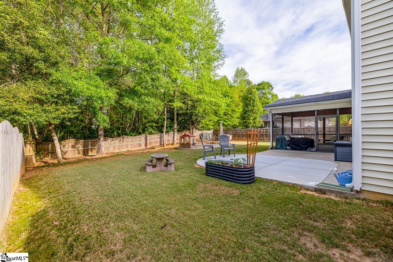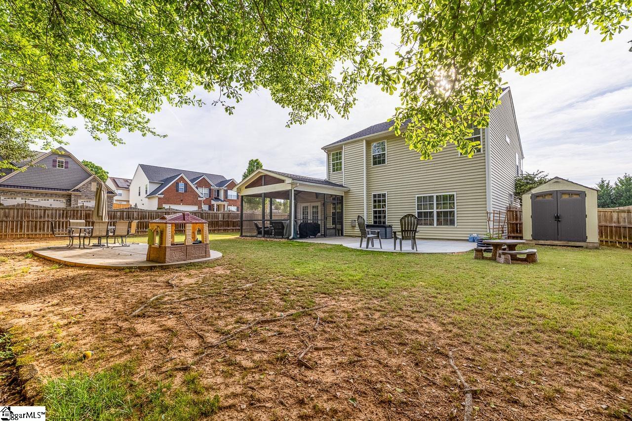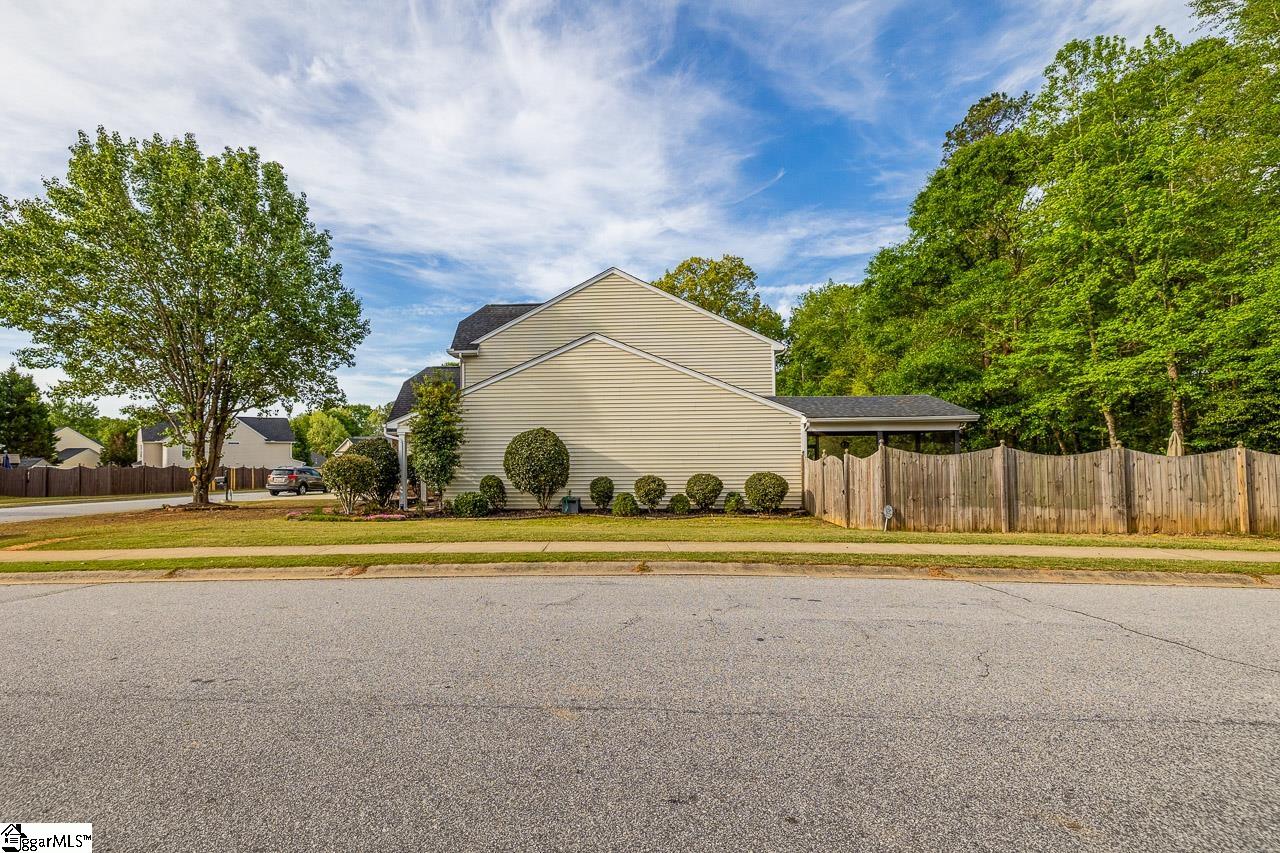 Welcome to this charming 4-bedroom, 2.5-bath traditional home nestled on a wooded corner lot in the sought-after Bells Creek community of Simpsonville. With approximately 2,218 square feet of thoughtfully designed living space, this home offers an open floor plan with soaring 9ft+ ceilings, hardwood floors, and a cozy gas fireplace. The main level features a spacious kitchen with solid surface countertops, a primary suite with a garden tub, separate shower, double sinks, and a walk-in closet. Upstairs you’ll find three additional generously sized bedrooms, perfect for family or guests. Enjoy relaxing on the screened porch overlooking the level, tree-lined backyard. The attached 2-car garage, paved driveway, and community amenities including a pool, common areas, and sidewalks round out everything this home has to offer.