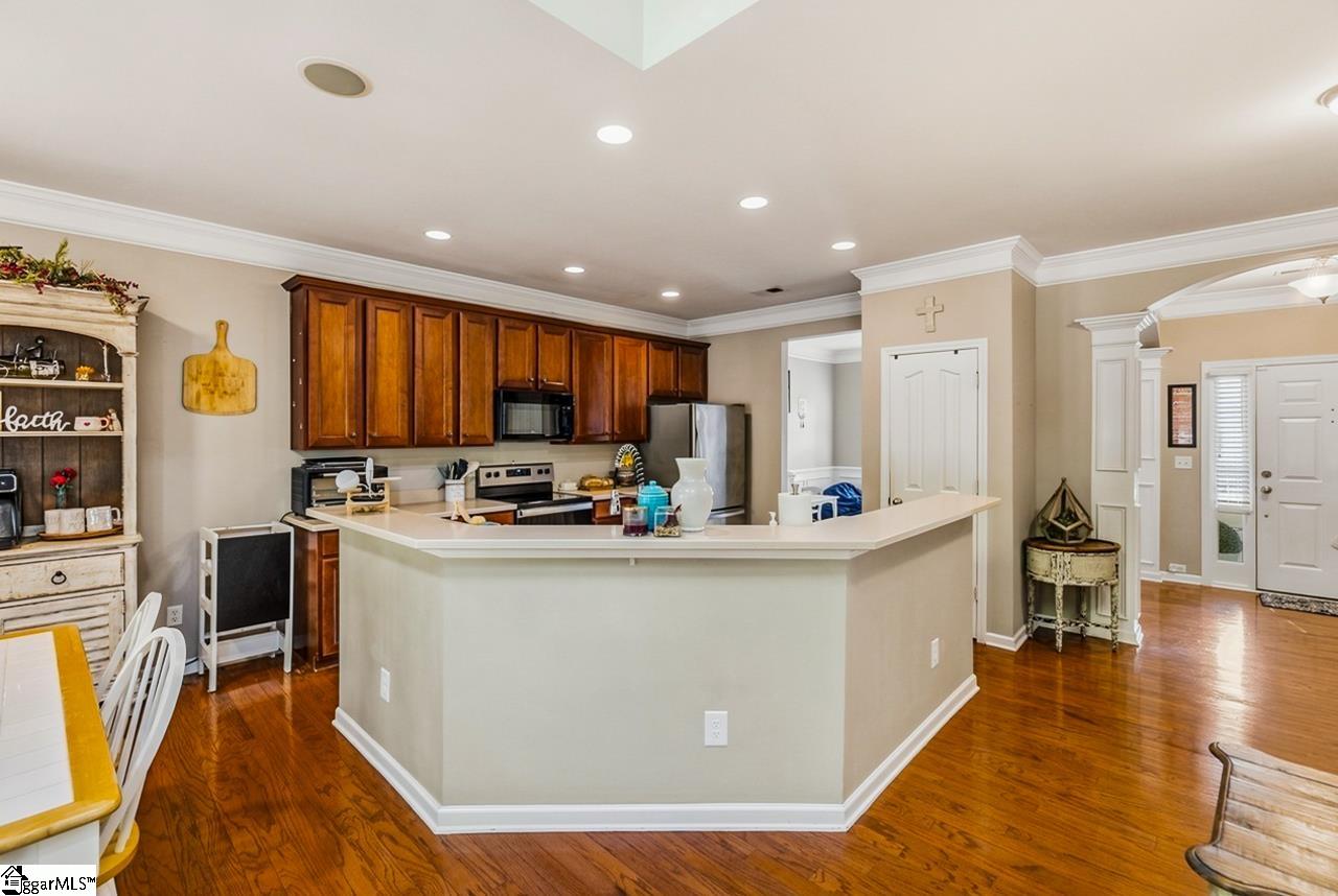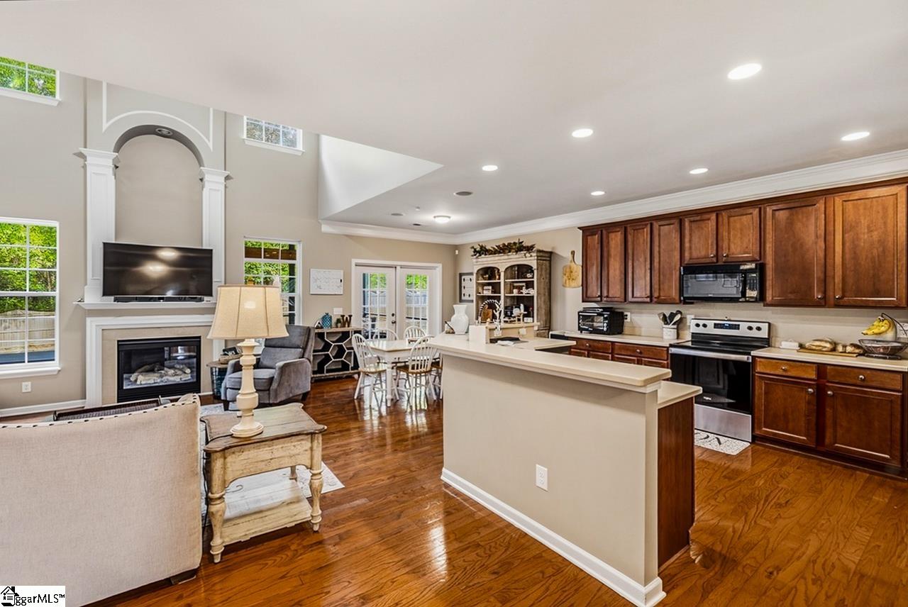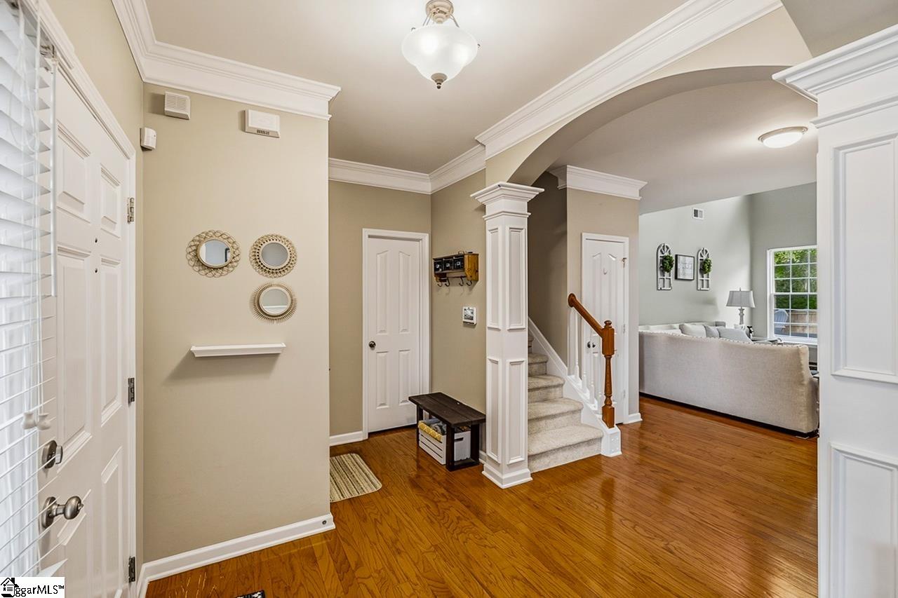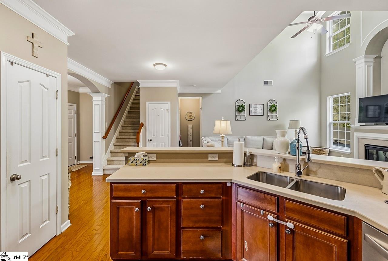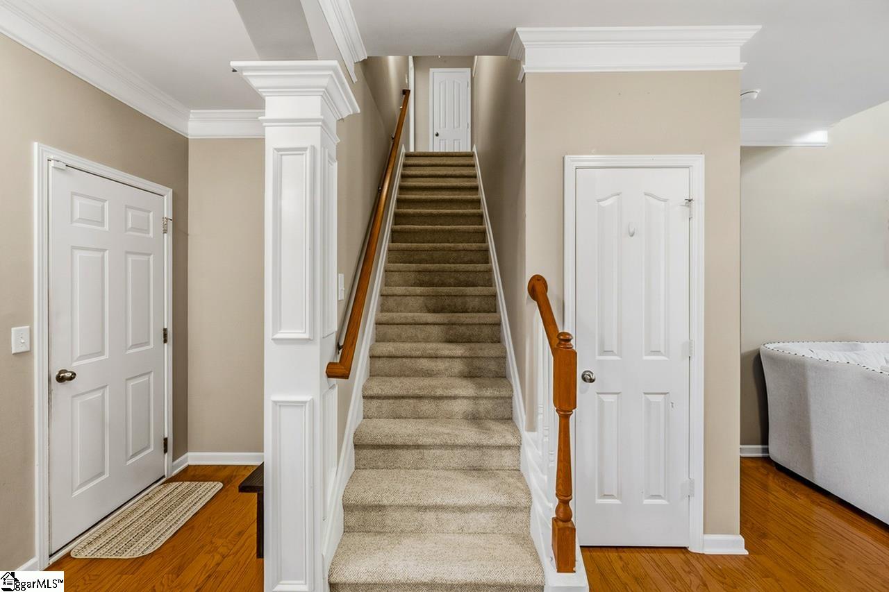 Welcome to this charming 4-bedroom, 2.5-bath traditional home nestled on a wooded corner lot in the sought-after Bells Creek community of Simpsonville. With approximately 2,218 square feet of thoughtfully designed living space, this home offers an open floor plan with soaring 9ft+ ceilings, hardwood floors, and a cozy gas fireplace. The main level features a spacious kitchen with solid surface countertops, a primary suite with a garden tub, separate shower, double sinks, and a walk-in closet. Upstairs you’ll find three additional generously sized bedrooms, perfect for family or guests. Enjoy relaxing on the screened porch overlooking the level, tree-lined backyard. The attached 2-car garage, paved driveway, and community amenities including a pool, common areas, and sidewalks round out everything this home has to offer.