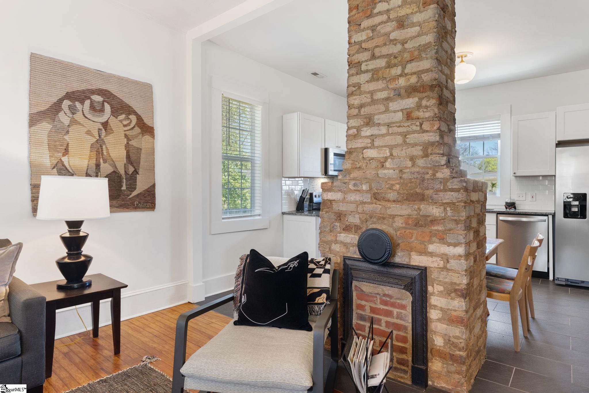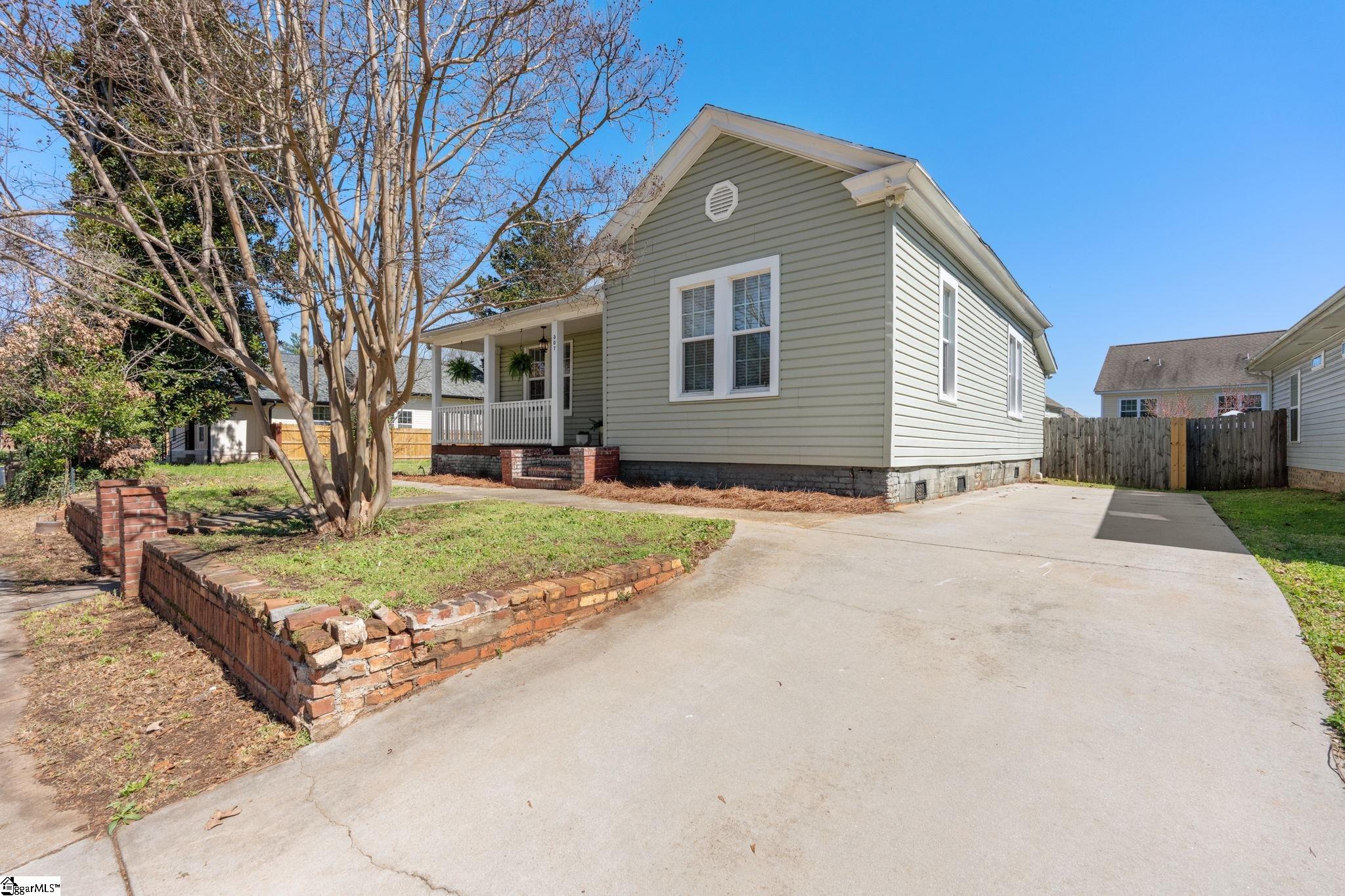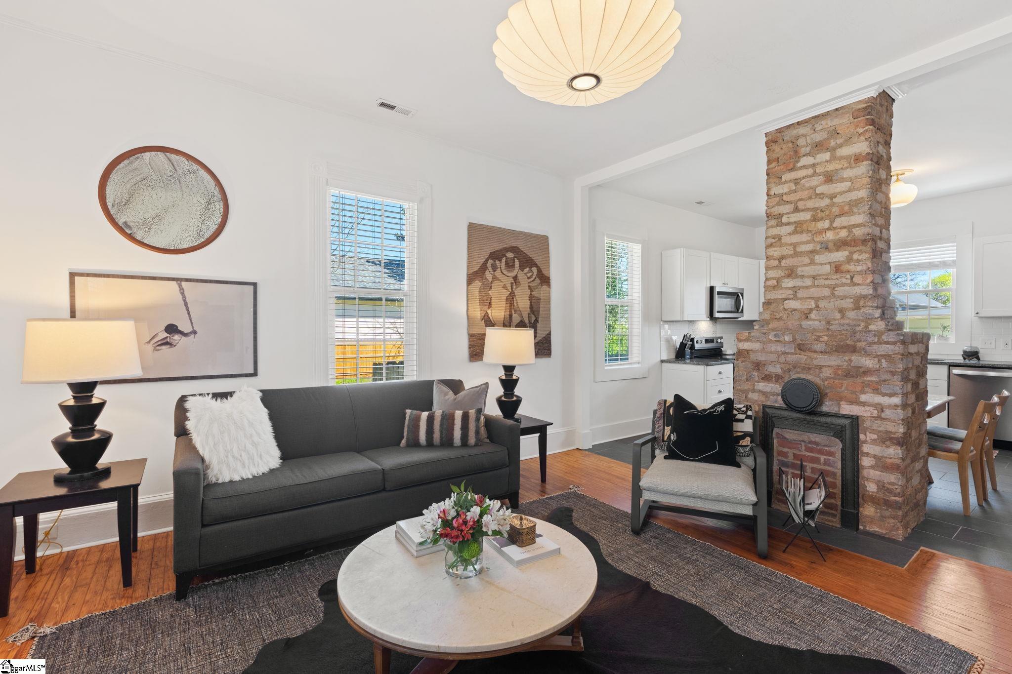Step into timeless charm and style at this beautifully curated bungalow in the heart of the West End, downtown Greenville. This 2-bedroom, 2-bath home blends thoughtful design with classic historic character, creating a space that feels both elevated and welcoming. Inside, enter into a wide foyer, and tall ceilings showcasing original hardwood floors, detailed moldings, and abundant natural light. Follow french doors into the living room which centers around a charming original brick fireplace, a gathering area perfect for entertaining or relaxing evenings at home. The kitchen has been stylishly updated with white shaker cabinetry, granite countertops, stainless steel appliances, and a timeless subway tile backsplash, offering classic beauty. The primary suite features a walk-in closet and a beautifully renovated bath with a large tiled bath/ shower and modern fixtures. A generous secondary bedroom offers oversized windows, ample walk in closet space, and unique character touches that reflect the home’s historic roots. Many of the original doors and hardware remain, preserving the bungalow’s 1930s charm while complementing its modern updates; most recently a brand new HVAC condenser unit as of March 2026. Outside, enjoy a private fenced backyard with plenty of room to relax, entertain, or expand. A concrete patio provides the perfect spot for outdoor dining and the backyard shed provides additional storage space for any overflow, garden tools or hobbies. Just blocks from Main Street, this home offers walkable access to Greenville’s baseball stadium (Flour Field), award winning restaurants and parks, festivals, and entertainment.