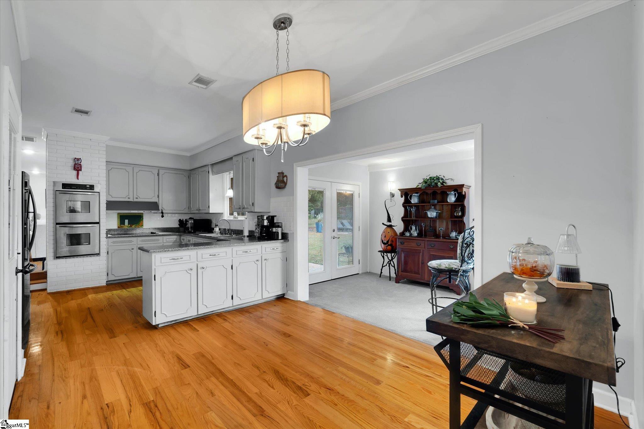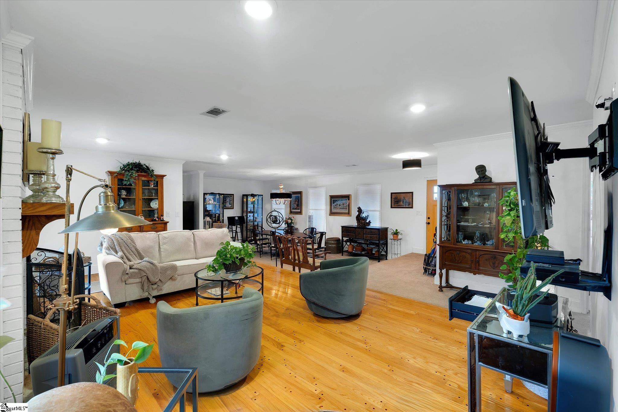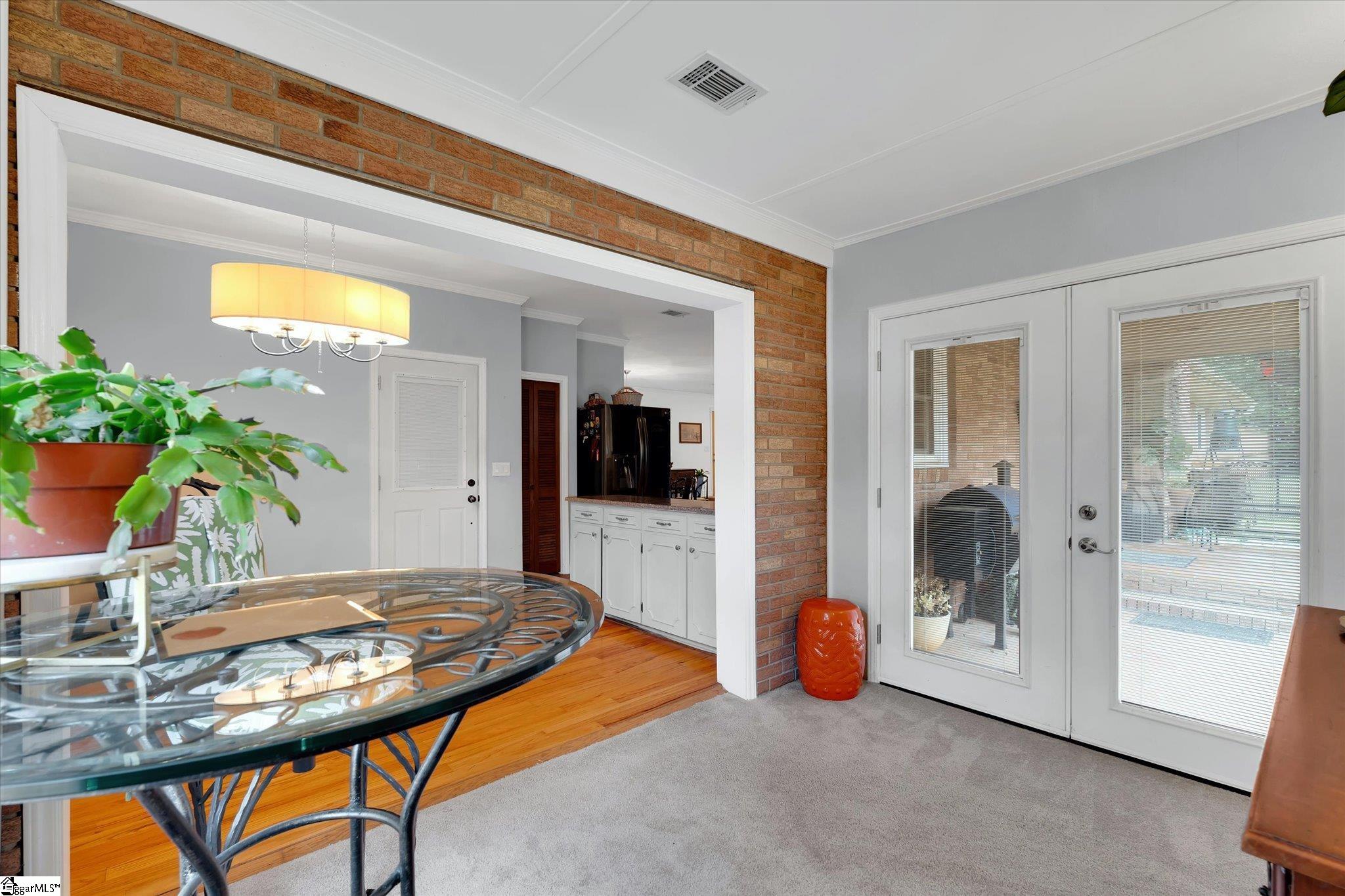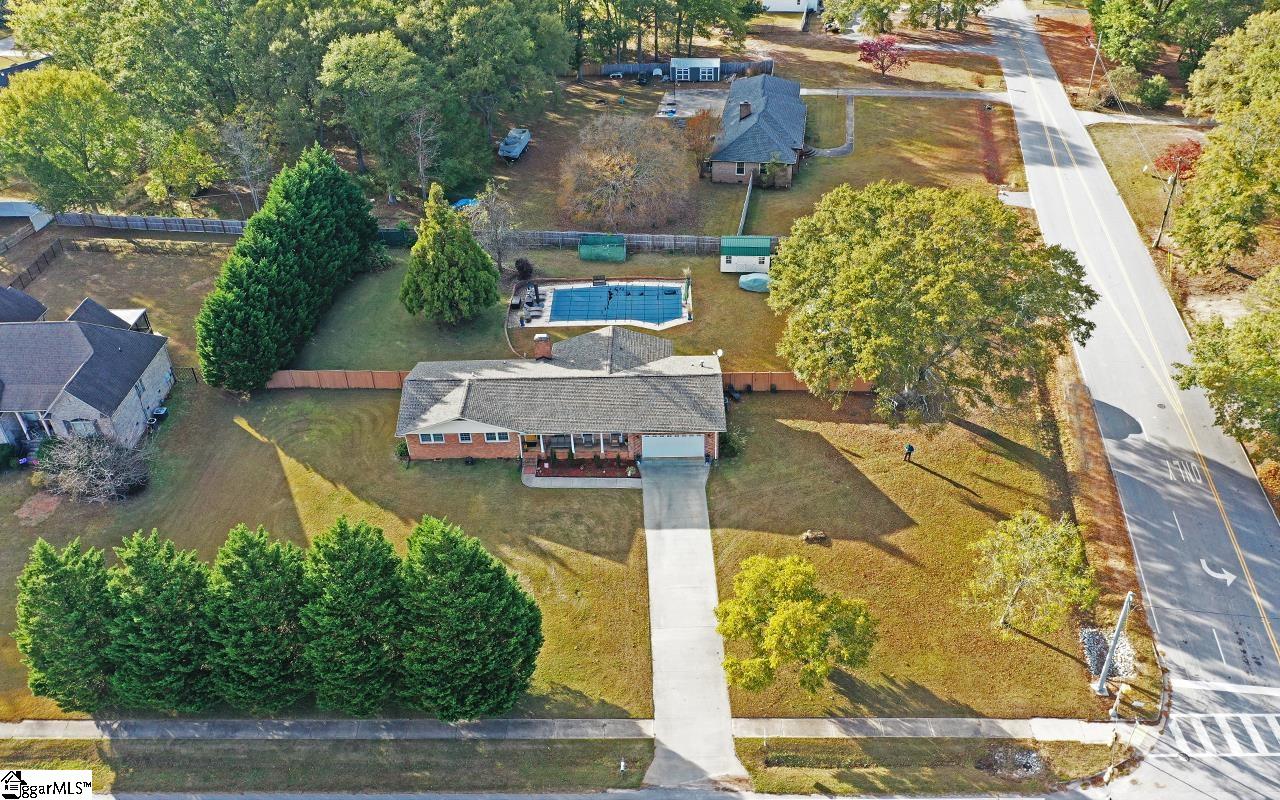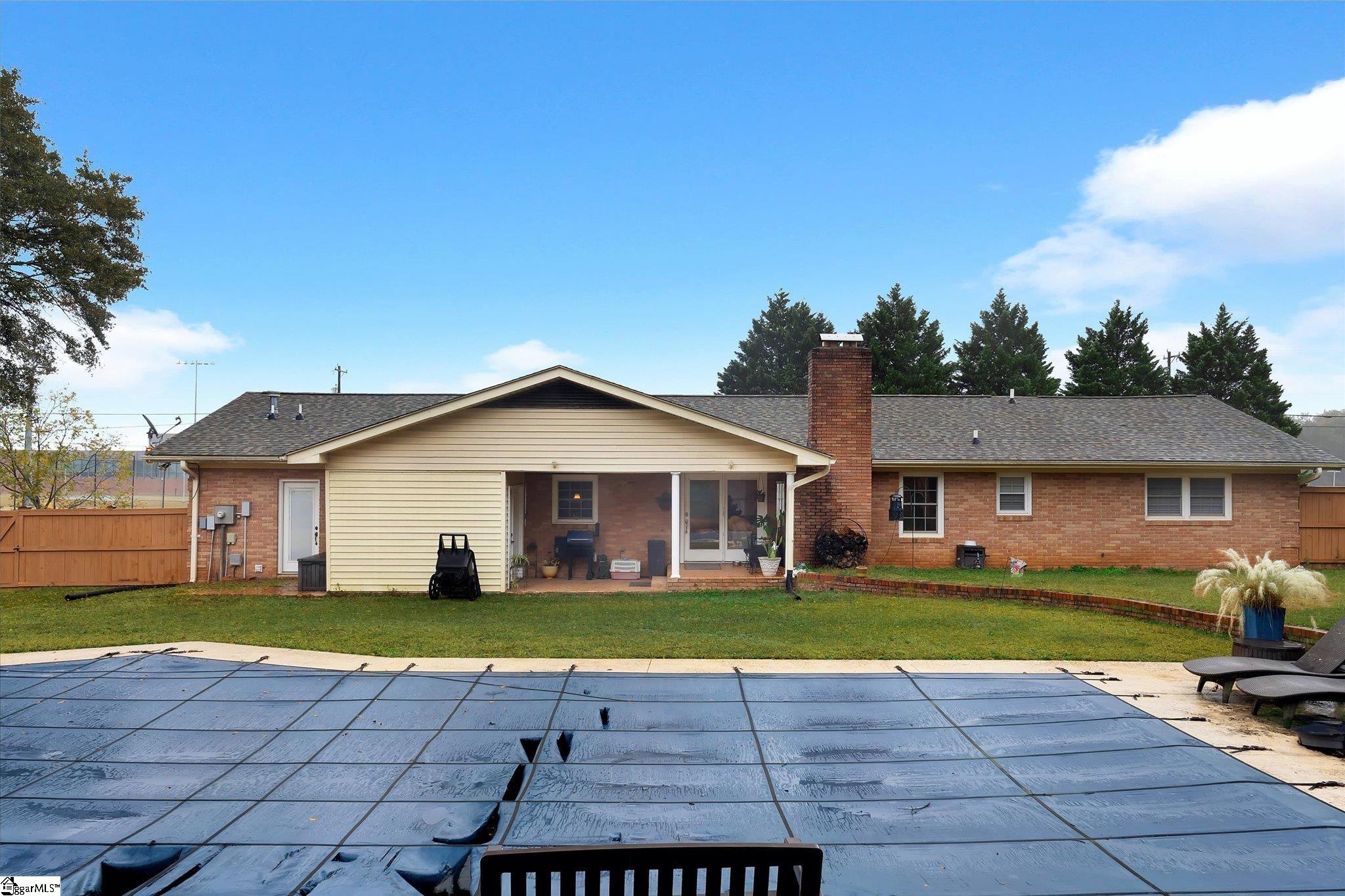 One-level all-brick home perfectly situated on a one-acre corner lot with an in-ground saltwater pool in Fountain Inn’s most desirable areas. Surrounded by other well-kept homes, this property offers a rare blend of space, comfort, and convenience—all within walking distance to downtown Fountain Inn and the Swamp Rabbit Trailhead via the sidewalk just out front. Inside, the open floor plan features a spacious living area that flows into the dining spaces and kitchen areas—ideal for both relaxing and entertaining. The kitchen boasts granite countertops, stainless-steel appliances, double ovens, and a pantry closet. The primary suite is a peaceful retreat with an updated en-suite bathroom showcasing double vanities with marble countertops, a tile shower with glass enclosure, and tile flooring. The second bedroom includes its own walk-in closet and private en-suite bath with a tile-surround tub/shower, which can easily convert back to a Jack-and-Jill layout for access from the third bedroom. Enjoy outdoor living at its best with a fenced backyard, two storage buildings, and a saltwater pool perfect for summer days. Additional features include an oversized two-car garage and a roof approximately 3 years old. Close to Carolina Springs Golf Course, Fox Run Country Club, and just minutes from Simpsonville and Greenville, this home offers the ideal mix of tranquility and accessibility. This One Is A Must See!